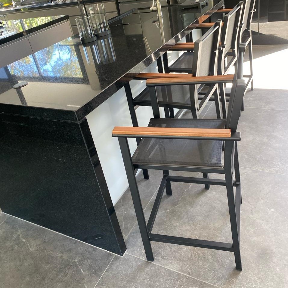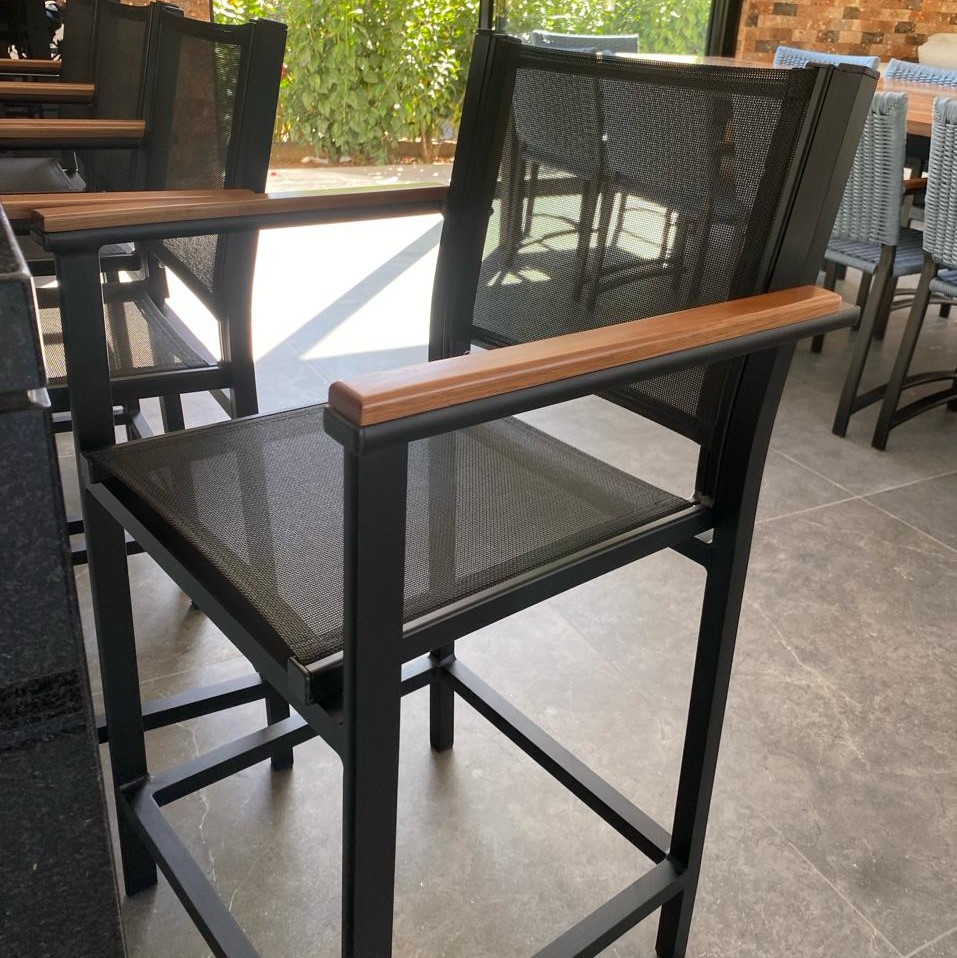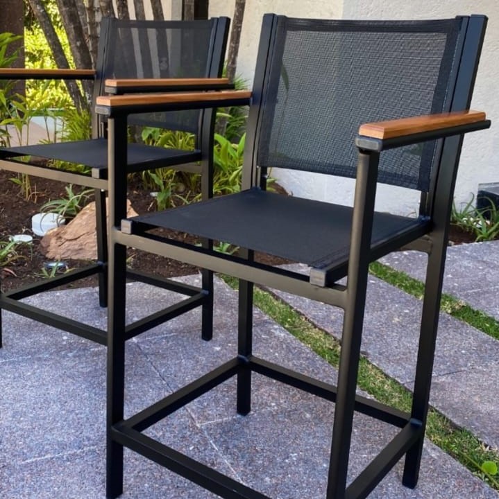 Banqueta de alumínio tubular na tela sling, pintado com pintura eletrostática. Material estruturado, banquetas que pegam ate 150kg, muito reforçadas. Perfeita para compor qualquer ambiente, seca super rápido, e os bracinhos de madeira, também é opcional. Todos os nossos modelos de banquetas com ou sem braço, nós fazemos o mesmo padrão para poltrona.